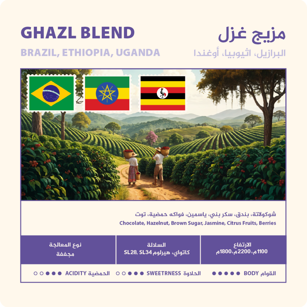 في نسب مدروسة لكل محصول في مزيج غزل المتميز، بإمكانك الاستمتاع بطعم الشوكولاتة والبندق والسكر البني والياسمين ً والتوت جميعا في كوب واحد. يعتبر مزيج غزل بقوامه الثقيل خيار مثالي لمن يبحث عن مشروبات اسبريسو متميزة تحتفظ بإيحاءاتها الفريدة حتى بعد مزجها مع الحليب.