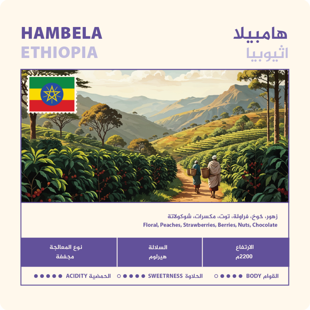 قهوة هامبيلا تقدم نكهات زهرية وفواكه مثل الخوخ والفراولة والتوت والشوكولاتة. تتميز بحموضة متوازنة وحلاوة معتدلة، مما يجعلها مثالية لمحبي القهوة
