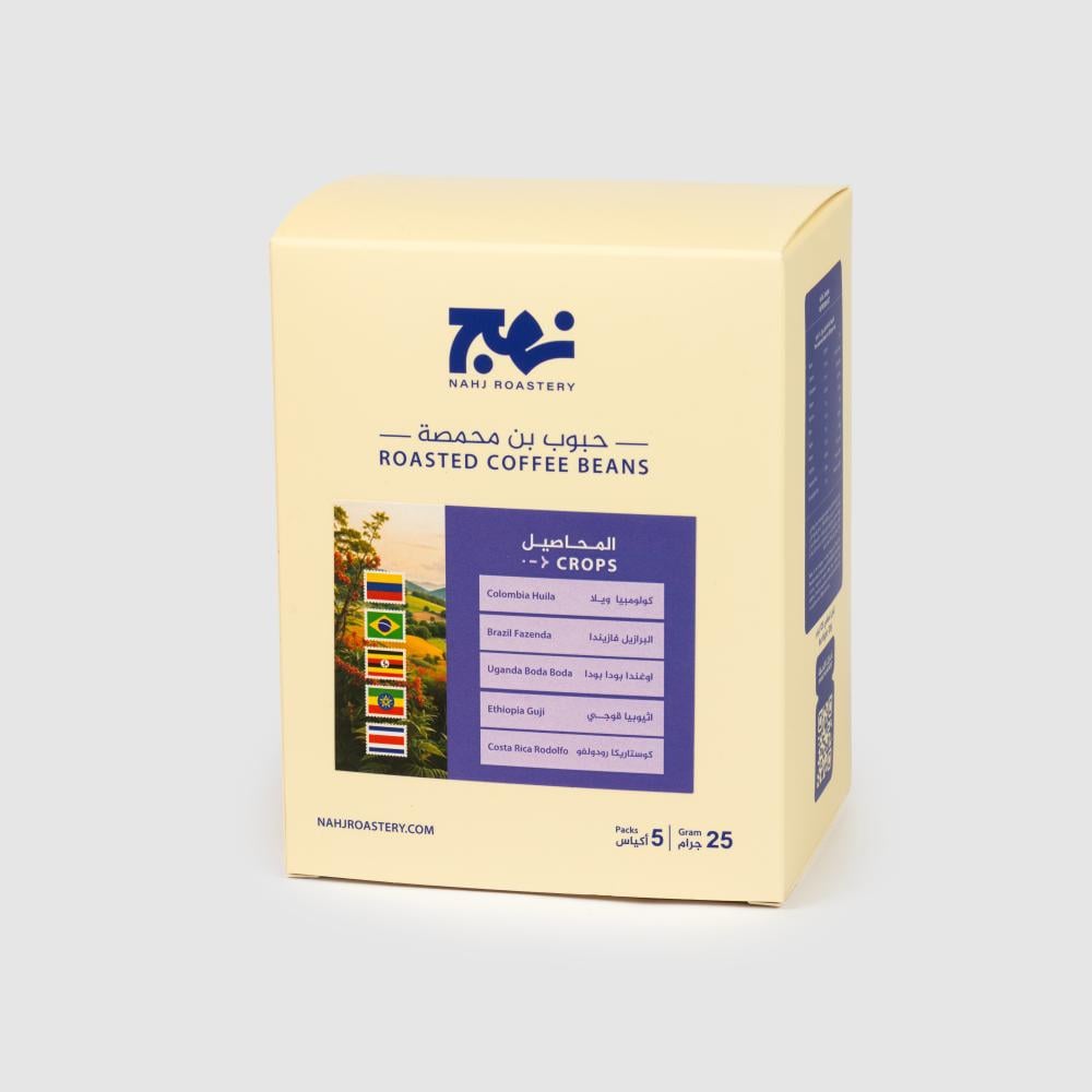بوكس أظرف حبوب بن محمصة يتكون من عينات بحجم 25 جرام من 5 أنواع مختلفة من القهوة